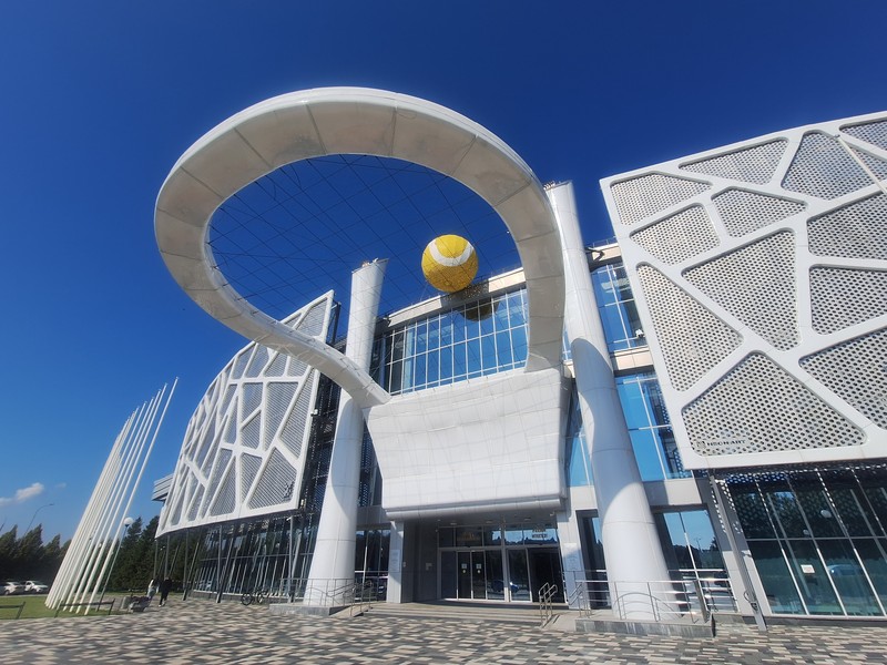 необычное здание, фасад которого представляет собой композицию из натянутой сетки, теннисного мяча и ракетки